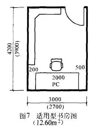 三室以上的户型宜设置书房。书房是供主人学习或家庭办公( 工作) 的房间。因无需摆放大床( 2. 2m x 2. 0m)和床头橱等家俱,所以其尺寸要求也不像卧室那样严格,具体可参见图7。它也像儿童房一样可使住宅套型设计更方便,即将受户面宽和户进深限制,不能将其设计为主卧、次卧、客房的空间设计为书房。当然,图7基本上是仅满足书房最低使用功能的适用要求,如果建筑面积足够大,也可按次卧图5、主卧图1、图2的开间进深尺寸设计书房,使书房达到舒适或高舒适的要求。这样还带来另一个好处,即书房可随时据需要改为卧室,增加了房间使用的灵活性。