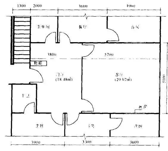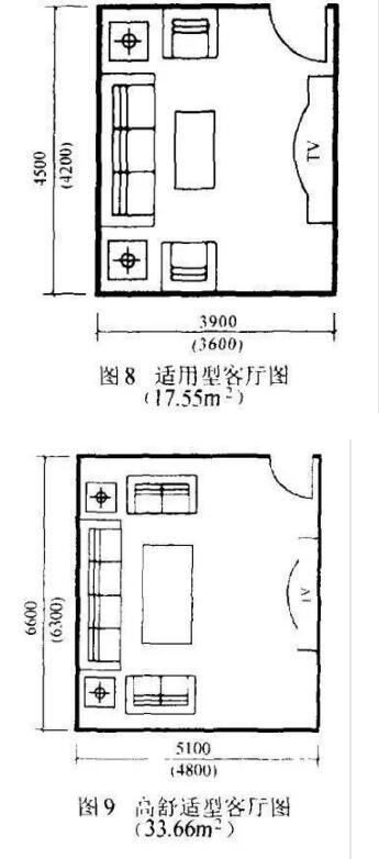 1.客厅的最低适用尺寸宜为开间3. 9m,进深4. 5m,建筑面积17. 55㎡,如图8所示。请注意,这种尺寸的客厅,只能满足29英寸或32英寸彩电的观看距离要求,彩电尺寸再大就不行了,所以它仅是适用尺寸。
