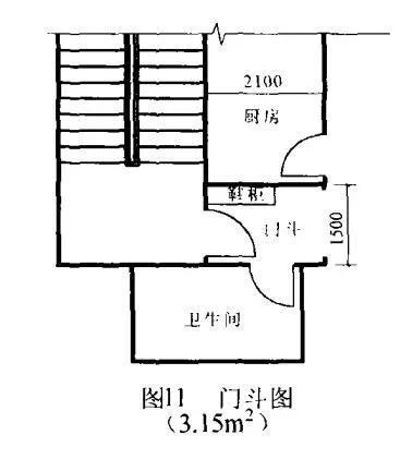 80㎡以上(不含80㎡) 套型宜设置门斗,它是进入户内的过渡空间,装修时做上一个造型优美的大门套,称之为玄关。它的开间尺寸宜为1. 5m以上,具体如图11所示。门厅是户建筑面积很大,比如160㎡以上时,方予设置的空间。