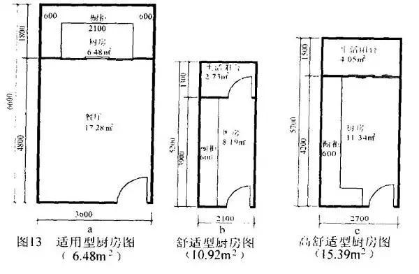 厨房是住宅非常重要的房间,它与套型舒适度关系极为密切。随着户建筑面积的增大,它的尺寸也随之加大。厨房的适用、舒适、高舒适尺寸大致如图13a、b、c所示。高舒适型厨房对于时尚家庭,若用作西餐厨房,可兼作家人小餐厅。