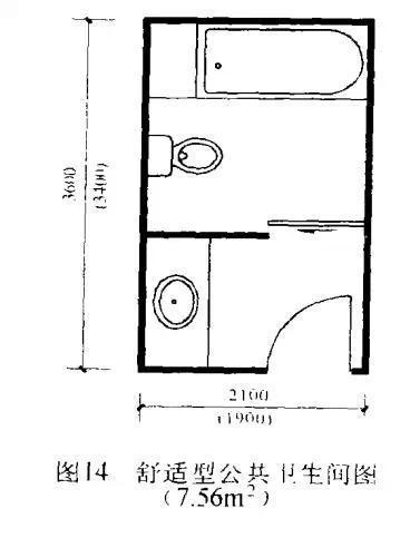 卫生间分公共卫生间和主卧卫生间。主卧卫生间以接近方形为佳( 便于洁具布置) ,尺寸可参照图3和图4或适当加大设置,这个尺寸摆放矩形或大三角形喷水按摩浴缸均够。公共卫生间以矩形为佳,因这样既可少占面宽又可将洗漱与浴厕隔开,使之可供一人洗漱一人浴厕同时使用,增加它的使用功能,使户型更加适用或舒适,具体如图14所示。该图尺寸基本上可达到舒适标准,若要改成适用或高舒适标准,可将其开间、进深适当缩小或加大。