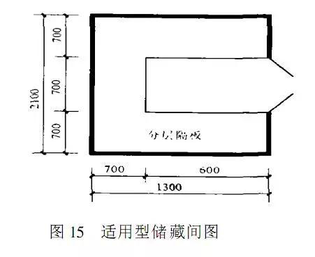 建筑面积 130㎡及以上的套型应设置储藏间,以便住户存放杂物之用。它的适用尺寸大致如图15所示。将其开间进深各增加300或600可使其达到舒适或高舒适要求。