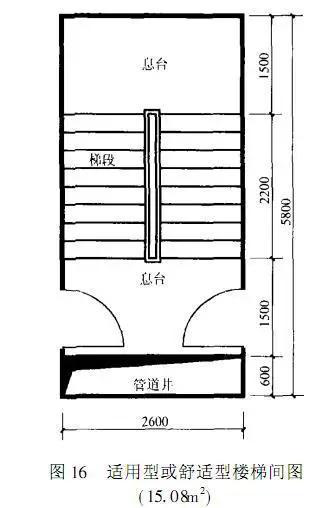 楼梯间的适用开间尺寸是2. 6m,进深尺寸是5. 8m,具体如图 16 所示。这个尺寸基本能满足人、家俱搬运、管道井设置等各种要求。梯段2. 2m,即八个踏步0. 275m x 8= 2. 2m,每层上18步,若层高为2. 8m, 每个踏步高0. 155m, 这是很适用甚至较为舒适的尺寸。若要达到高舒适标准,可将开间增为2. 7m,进深增加为6. 0m,梯段长增为2. 4m(踏步宽由0. 275m增为0. 3m)。