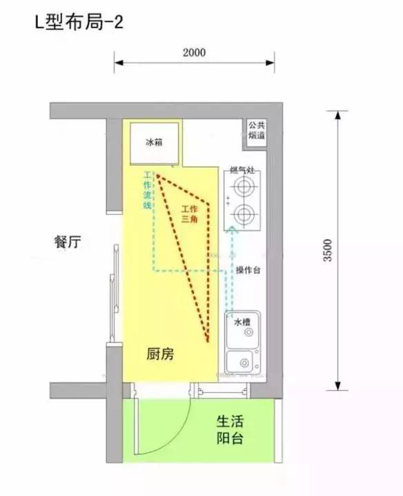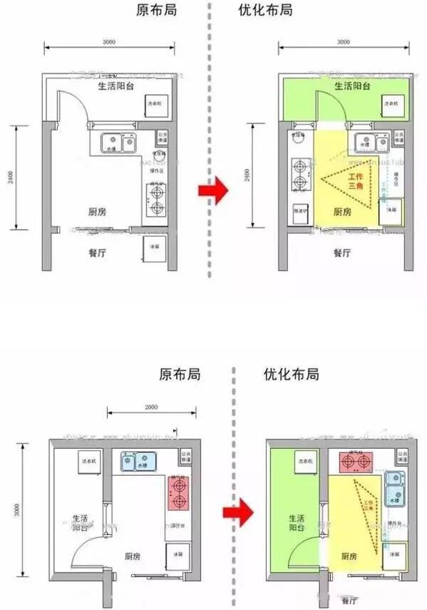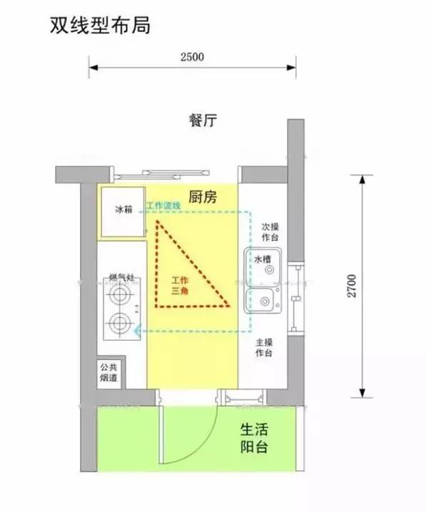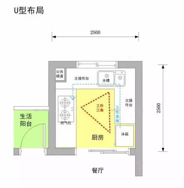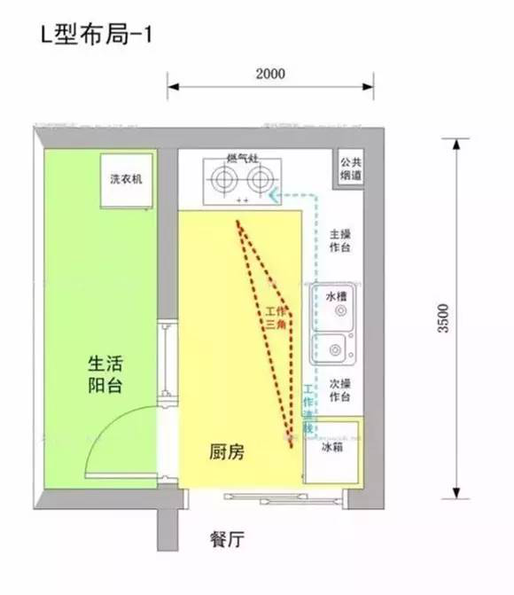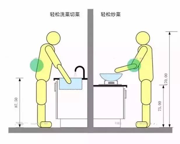 根据人体工程学原理,及厨房操作行为特点,橱柜工作区台面,应划分为不等高的两个区域。水槽、操作台为高区,燃气灶为低区。