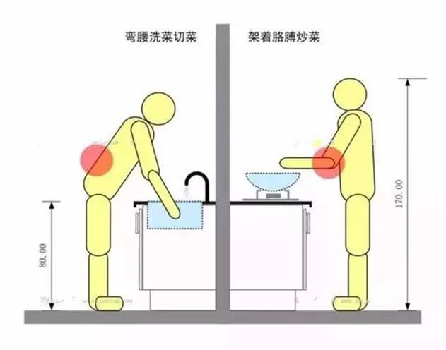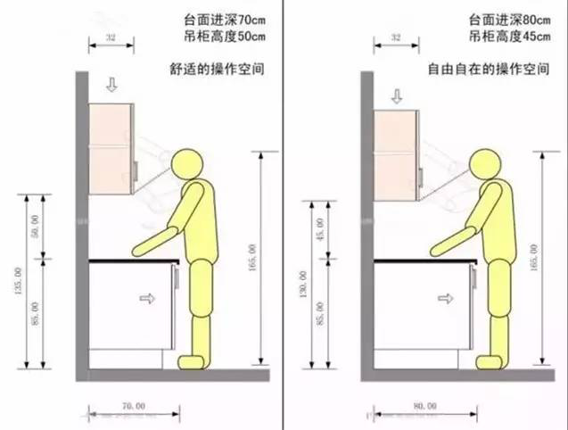 橱柜设计高度对减少疲劳和便捷操作起决定性作用。橱柜高度设计,主要包括工作区台面高度及吊柜高度两部分。