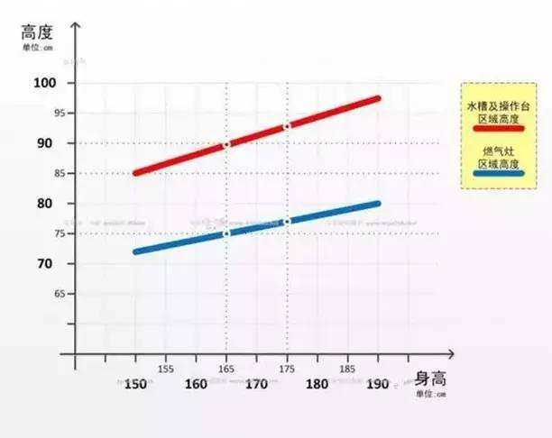 橱柜工作区台面的两个高度设计,建议根据家庭中主要下厨人员的身高,参考下图: