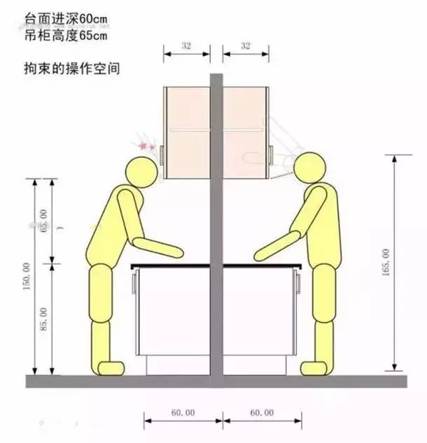 吊柜布置高度,同样决定了取放物品的便捷性。通常情况下,吊柜的便捷使用跟工作区操作自由舒适是冲突的。如果吊柜高度布置较低,方便取放东西,但同时压缩了操作区上空空间,影响视野,使操作压抑拘束,头部容易碰到柜门。
