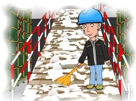1、脚手架、脚手板有冰雪积留时,施工前应清除干净,随时检查架体有无松动及下沉现象并要求所有进入施工现场作业人员在冬季施工期间穿防滑鞋。