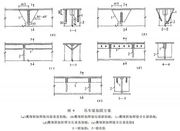 当吊车梁腹板上部出现裂纹时,应检查和先采取必要措施如调整轨道 偏心等,再采用堵焊的方法修补裂纹,然后根据裂纹的严重程度和吊车工作制类别分别选用图6中的方法来进行加固处理。