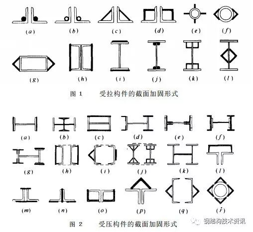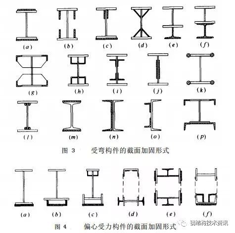 采用加大截面的方法加固钢构件,应考虑构件的受力情况及存在的缺陷,在方便施 工、连接可靠的前提下选取最有效的截面增加形式,所选截面形式应有利于加固技术要求并考虑已有缺陷和损失的状况。(图1-图4 ),给出了各类受力构件的一些截面加固形,可供设计时参考。
