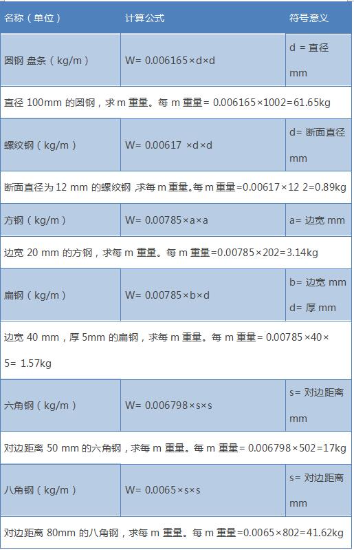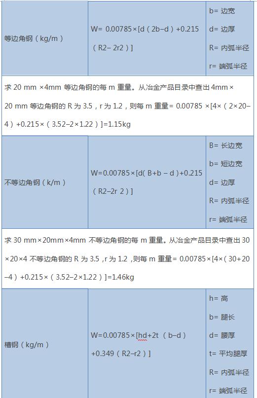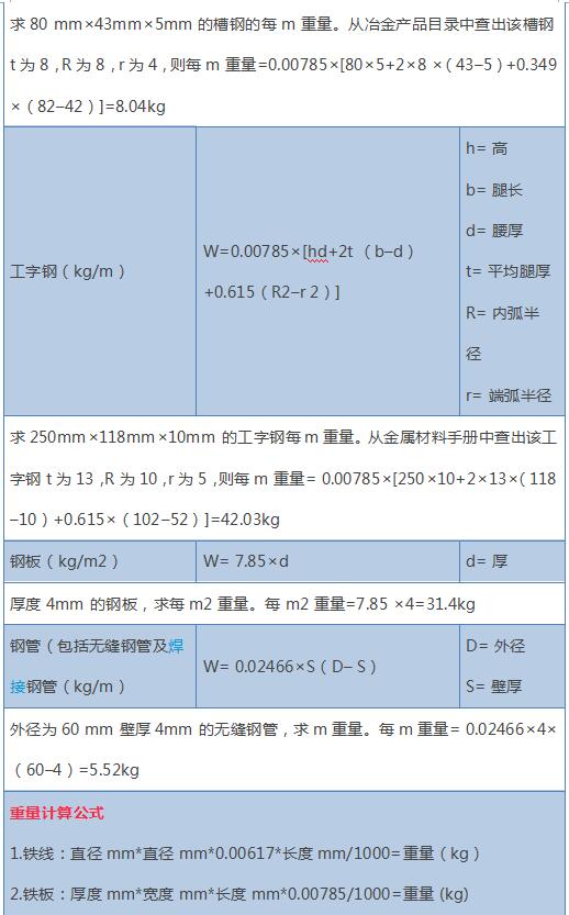 7)扁钢重量(kg)=0.0075*厚度*边宽*长度;