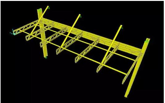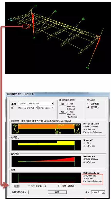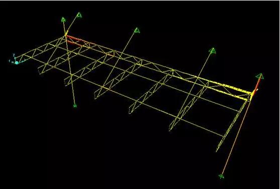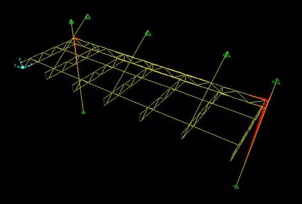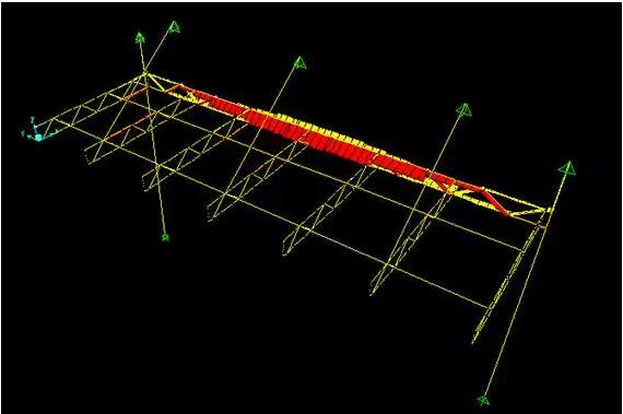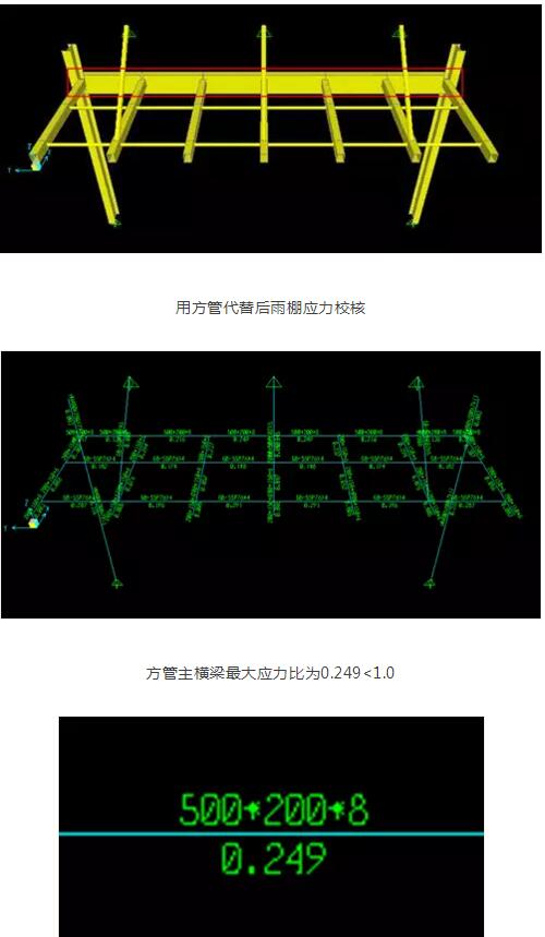 特别提醒:综上所述,雨棚结构构件的强度验算满足规范要求。 悬挑梁端部的最大挠度值为23.1mm3250/125=26.0mm 支座主横梁跨中挠度最大值为7.74mm9000/250=36mm 综上所述,雨棚结构挠度验算满足规范要求。 支座主横梁若不采用桁架形式,而采用直接单根型材,将支座主横梁换成500*200*8的方管,单独验算其强度和挠度 红色线框内表示代替桁架形式横梁的方管横梁 用方管代替后雨棚应力校核 方管主横梁最大应力比为0.2491.0 所以代替后,其强度满足规范要求。 主横梁采用单根型材后,成为一个常规的弯剪构件,在横梁跨中出现最大弯矩,相应位置一并产生最大变形。 支座主横梁跨中挠度最大值为6.30mm9000/250=36mm雨棚结构构件挠度验算