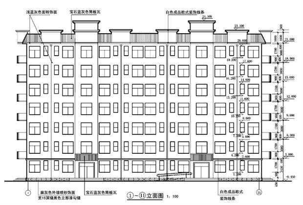 5、表明外墙各部位建筑装饰材料做法,浅蓝灰色面砖饰面。