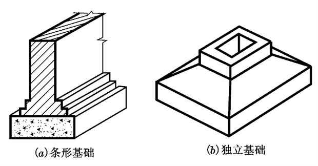 在民用建筑中,常见的型式有条形基础(即墙基础)和独立基础(即柱基础),如图79。