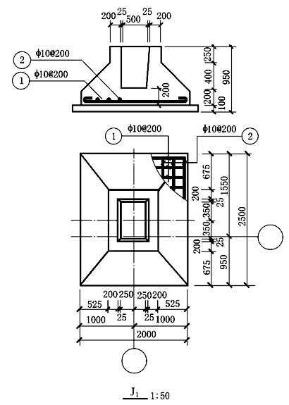 钢筋混凝土独立基础除画出基础的断面图外,有时还要画出基础的平面图,并在平面图中采用局部剖面表达底板配筋,如图83
