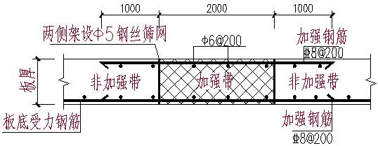 从图2可以看出,后浇带处增加了上下两个网片,x方向筋为圆8间距200,y方向筋为圆6间距200,x方向伸入基础板内1000。