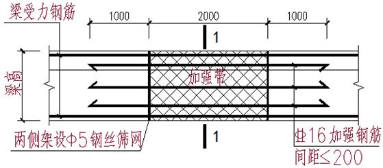 从图3、图4可以看出,后浇带处增加了三级圆16的钢筋,间距为200。根数可根据以下公式计算,加强筋根数=(梁高-板厚-保护层)/间距(向上取整)-1。