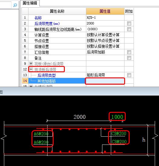 定义基础梁后浇带属性后,在后浇带侧面筋行填写属性值3C16(注意只田一侧根数),将伸入原梁内长度填写为1000,如图6所示。