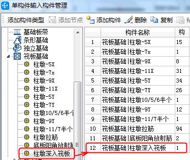 从图5可以看出,我们把底筋伸入基础板内的长度设置为0,我们需要在单构件里把这些钢筋的长度补上,先见构件,建立好的构件如图7中的红框内名称。