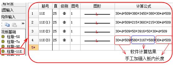 因为我们刚才把软件里入构件内的长度设置成0了,我们在单构件里要把这个长度加上,由于斜坡长度不同,我们要从软件计算结果中复制全部长度,然后再加上两头入基础板内的长度,如图11所示。