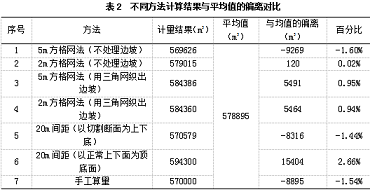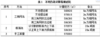 2、不同的剥离体积计算方法 2.1方格网法方格网法就是用固定尺寸的方格网对挖方范围进行有规则的分块,先计算出每一个小方格块的体积,体积之和就是整个挖方体积。选取的方格网大小决定了最终的计算精度。剥离工程土石方工程量一般较大,考虑边坡与不考虑边坡时的体积之差绝对值相对较大。用方格网法计算时,对于挖方的边坡问题,有不同的处理方法,分述如下: 2.1.1不处理边坡的情况一般挖方的结果都是挖出一个顶面积大底面积小的坑状结构,设S1为挖方顶面面积,S2为挖方底面面积,则一般情况下S1>S2。计算土方量时,可以S1的边界为计算范围向下做垂直切割,以原始地面标高数据为顶面,以测量的底面坐标高程数据所织成的三角网为底,计算出体积V顶。同样以底面面积S2的边界为计算范围向上做垂直切割,以原始地面标高数据为顶面,以测量的底面坐标高程数据所织成的三角网为底,计算出体积V底。上述两个体积可以用软件很方便的进行计算。实际挖方体积v可以认为是:V=(V顶+V底)*0.52.1.2用三角网织出边坡的情况既然是利用方格网法计算挖方工程量,在方格网的顶面标高确定的情况下,方格网的底部标高高程数据就决定了每一个方格网的体积。在织底部三角网时,可以考虑将边坡处的坐标高程及边坡坡顶处的坐标高程一并作在一起,相当于将底及四周认为是一个整体的盆状结构,原始地面标高为盆顶,盆底及盆顶所围成的结构体积就是要计算的挖方体积。 2.2断面法假设每隔一定距离(如20m)选一断面。断面法算量的基本原则就是将不规则结构体分割成相对比较规整、可以用数学方法近似计算的结构。同样切割出的断面也有不同的体积计算方法。 2.2.1以断面的切割面面积为上下底计算在这种情况下,断面之间的垂直距离h是可以确定的,只要确定出切割形成断面的具体面积S1和S2,则可以用:V=(S1+ S2)*0.5*h来确定两个断面之间的结构体积,所有断面所形成的结构体积之和就可以认为是整个挖方结构的体积。 2.2.2以切割形成结构的上下面为顶底面计算以切割形成结构的上下面为顶底面计算体积时,以顶面面积S1和底面面积S2及顶底面之间的距离h为依据据来计算体积。确定S1时可以该面的水平投影面积代替,S2可以用同样的方法处理,以底面的水平投影面积代替。h的确定就比较复杂了,可分别求出顶面和底面测量数据标高的平均值,h值可以该平均值之差来近似代替。这种方法要求测量的高程点均匀、有规律,取舍高程点时的人为倾向对结果可能造成一定影响。在土方挖掘量比较大时,若每一切割结构体的h都同时偏大或偏小,对最终结果造成的影响将是很可观的。 2.3直接切割算量 2.3.1 手工直接在图纸上切割算量这种情况和断面法计算有点类似。可以凭借观察将结构划分成比较规则的可以用数学方法直接计算的形状,用比例尺在图纸上量出长度及距离,通过观察得到相应的高程差,计算出单个结构的体积,体积相加就为总体体积。这种方法简便易懂,不需要计算机及专业计算软件等工具。可以用于工程量的大致估算,计算过程不复杂,计算结果在估算的程度上可以采用。缺点是精度比较低,误差较大且无法纠正。在计算条件不具备且对结果要求不太高的地方可以采用。 2.3.2 在计算机上切割算量这种方法与上述方法类似,只不过具体的切割过程避免了手工做图操作上的误差,但依然需要采用人为方式来确定挖方体结构的高度,依然不能有效处理边坡对体积的影响。 (1)方法一中计算每个方格网的体积及体积相加完全可以通过软件来完成(如南方CASS等),这种方法充分利用了计算机的数据处理功能。在数据确定的情况下计算结果唯一,比较容易核对和检查,方便直观。在边坡角不一致时,可以顶面、底面面积为范围垂直切割所形成的结构体积的平均为所求挖方的体积,这种情况有一定误差,但计算过程简便,可以在很短时间内确定出具体的体积。若将整个边坡(包括坡顶、坡底)与底面一起织成三角网作为计算体的底面来计算体积,在边坡比较平缓的情况下,方格网取的越小则计算精度越高;在边坡较陡的情况下很明显误差将会加大,且计算结果是比真实体积要少。一般剥离测量时,原始地面及开挖后的底面标高以数据形式测得。总体说来,这种方法的计算精度相对较高,且快速、合理、直观,适用范围广泛。 (2)方法二断面法计算时,工作量相比方格网法有所增大,尤其是确定每个断面(顶面、底面)面积时,即使用软件计算确定断面面积也比较麻烦,且容易出现差错。这种方法优点是比较直观易懂,但计算过程较复杂,不容易核对,断面的切割方法不确定,随着工程向前推进,断面的切割方法及切割位置也需要变化,不适于操作。在结构比较均匀变化不大时,用这种方法计算比较合理,一旦结构变化较大用断面法处理时就会产生较大误差。以切割形成结构的上下面为顶底面计算时,面及面之间的距离都是确定的,体积比较容易确定;以正常切割断面所形成的上下面为顶底面计算体积时,顶面与底面之间的距离要靠观察数据来确定,操作者站在不同的立场,取点时会有不同倾向,实际应用中,这种方法的操作会受到一定影响。 (3)方法三手工切割算量,误差较大。即使在计算机上精确测量距离和高度同样会产生较大误差。这种方法切割断面时人为的主观因素较大,不同人、不同的切割方法都会