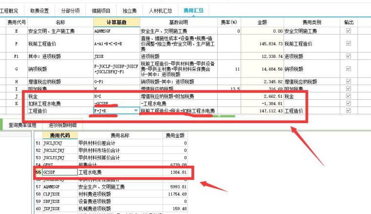 在费用汇总中插入一行费用,个人觉得这个工程水电费扣除应该放在税金之后,因为工程水电费属于工程造价的一部分,取税基数应该包括工程水电费。具体设置看我的截图。(其实水电费在造价中已经计取了税金,施工用水电费在各个定额中包括,生活用的水电费在企业管理费中包括了)所以扣除水电费,直接在总价中扣除即可。