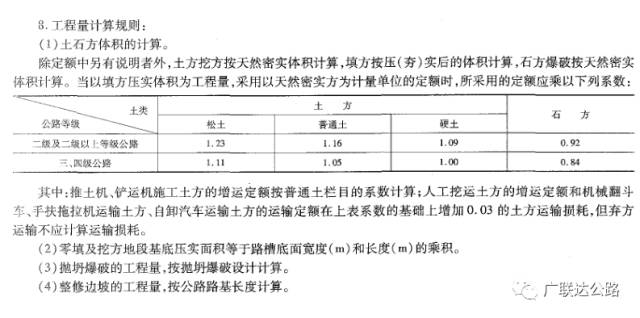 路基工程预算编制时,应先分析路基土石方数量汇总表中挖方与填方数量有否考虑路槽体积,否则预算取数据时有误;路基土石方计量中未扣除利用方,全部考虑计价方有误;填方路段借土工程量计算不正确,因为填方是按压实方体积计算,借方开挖、运输是按天然密实方体积计算,定额运用时挖方数量、运输数量,需按填方压实数量分别乘下列说明中的系数取用。