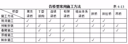桥梁的施工方法虽然很多,但都有其一定的适用范围和条件。表4-13是各种桥型常用的施工方法。