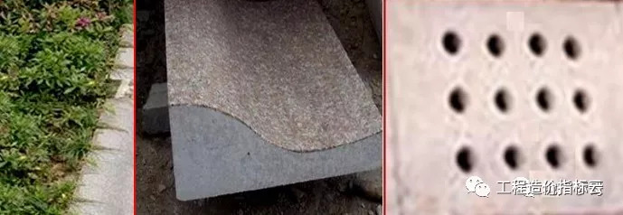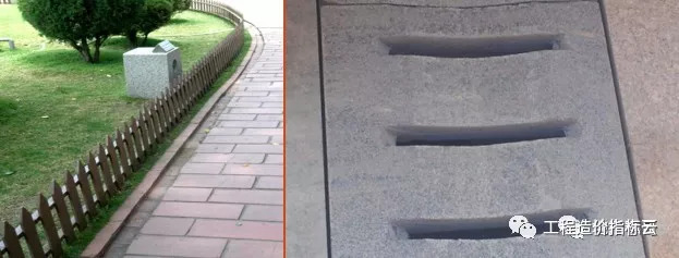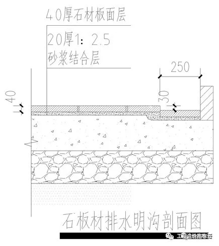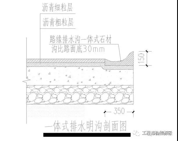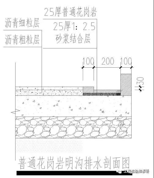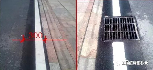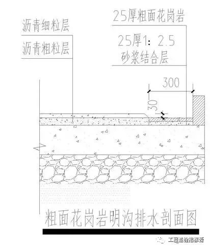 沥青路与路缘石交界处设置300mm宽的100100粗面花岗岩,该部位比沥青路面标高下降30mm形成明沟。