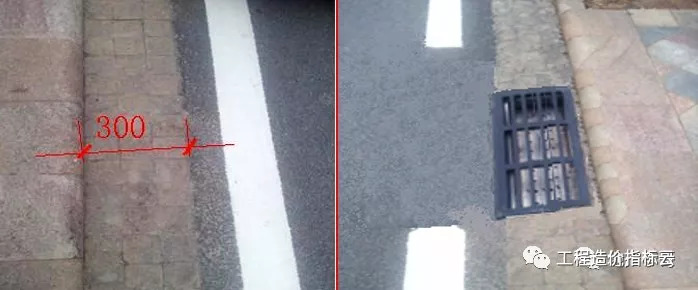 沥青路面靠路缘石处留置明沟排水,宽度300mm,深度30mm;雨篦子30050025