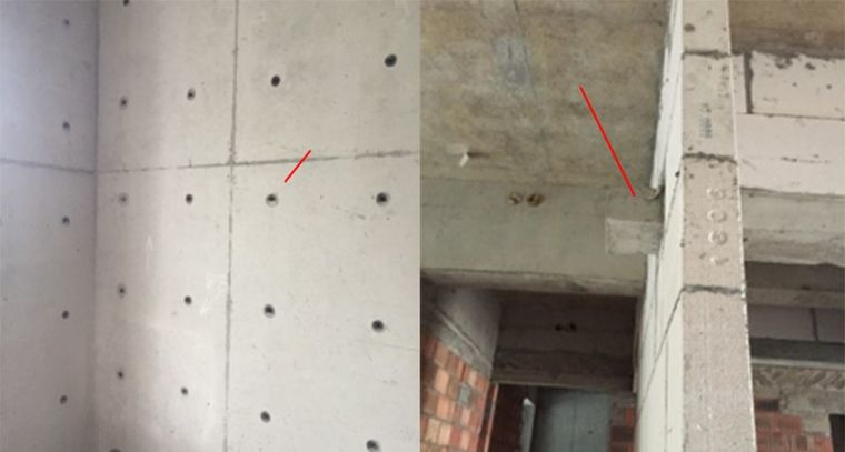 ▲剪力墙螺杆洞未封堵密实,且多余的预制过梁未切除