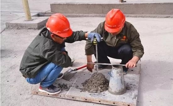 4、检查混凝土的坍落度,梁柱的坍落度要大点,板的坍落度要求不是很高。有时候混凝土站出来的砼干湿不一样,水给你多加,混凝土倒下去都不要扒的,泥水工最喜欢 ,但是砼强度达不到标准,所以第一车混凝土一定要测坍落度,后面的虽不用全部测,也得随机抽查,一般工地监理和甲方旁站的时候一定会检查坍落度的,坍落度一般在12cm~14cm。