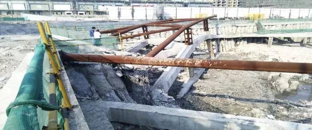 由于施工抢进度,超量挖土,支撑架设跟不上,是围护体系缺少大量设计上必须的支撑,或者由于施工单位不按图施工,抱侥幸心理,少加支撑,致使围护体系应力过大而折断或支撑轴力过大而破坏或产生大变形。