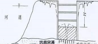 由于对承压水的降水不当,在隔水层中开挖基坑时,当基底以下承压含水层的水头压力冲破基坑底部土层,发生坑底突涌破坏。