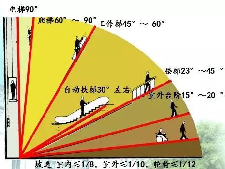 角度法:一般楼梯的坡度在23~45之间,30为适宜坡度。坡度小于20时,采用坡道;坡度超过45时,则采用爬梯。