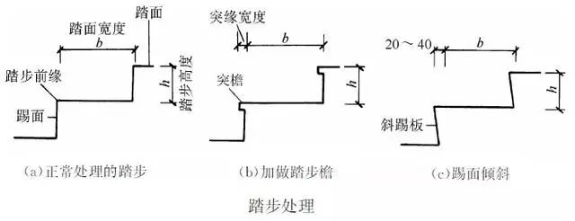 当进深受限,为了人们上下楼梯时更加舒适,在不改变楼梯坡度的情况下,可采取踏面挑出和踢面倾斜的方法解决。