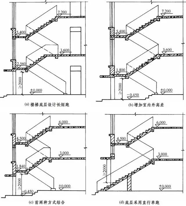 当楼梯底层中间平台下设置通道时,为满足平台下方空间净高2000mm,常采取右侧几种处理方法: