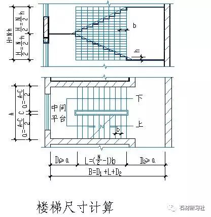 (3)根据初选中间平台宽D1(D1a)和楼层平台宽D2(D2a)以及梯段水平投影长度L检验楼梯间进深净长度B,D1+L+D2=B。如不能满足,可对L值进行调整(即调整b值)。