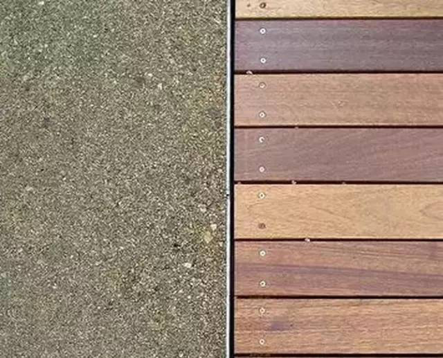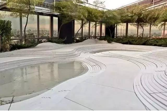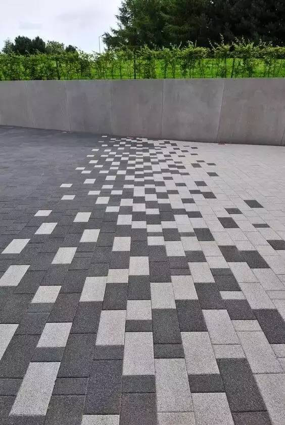 这种方式能达到相互渗透的效果,经常运用在硬质铺装中的局部区域暗示,或硬质软质之间的过渡,这种渐变往往通过两个材料密度的变化和尺寸大小的改变来实现。设计时充分考虑材料的模数关系、切割方式和组合逻辑,会大大提高其可实施性。