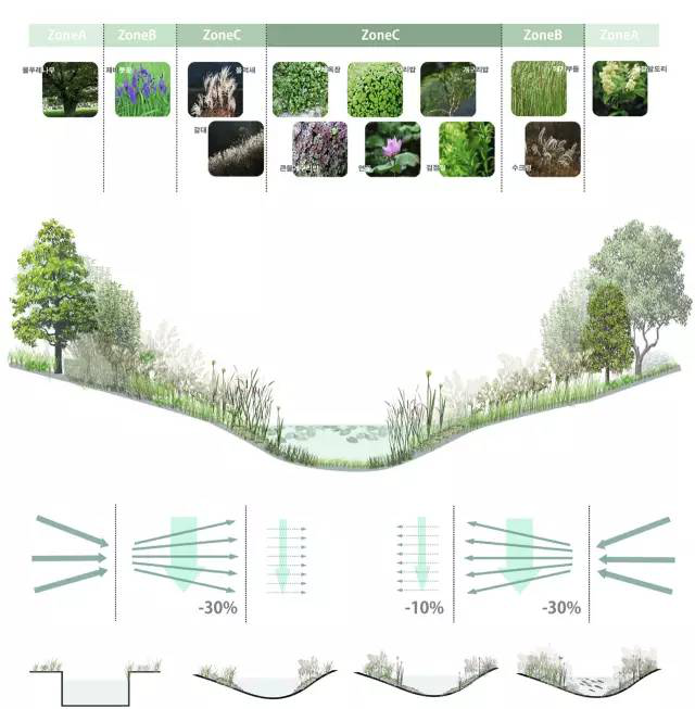 2)消落带策略:消落带是指河流、湖泊、水库中由于季节性水位涨落,致使被水淹的土地出露水面,周期性成为陆地的区域。消落带的植物选择应选择在汛期耐水湿,枯水期耐干旱的植物。