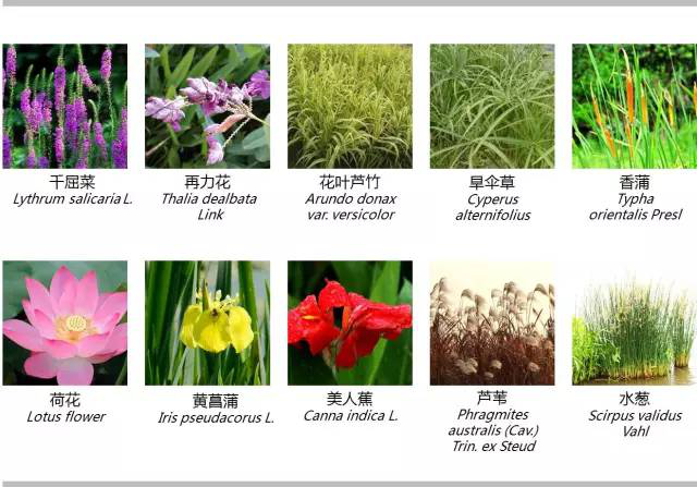 千屈菜、黄菖蒲、柽柳、美人蕉、芦苇、香蒲、菖蒲、石菖蒲、睡莲、凤眼莲、金鱼藻、荇菜、荷花、水葱。