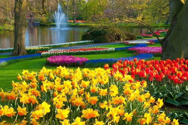 17、高有落叶乔木,低有常绿灌木,下有草坪花卉。