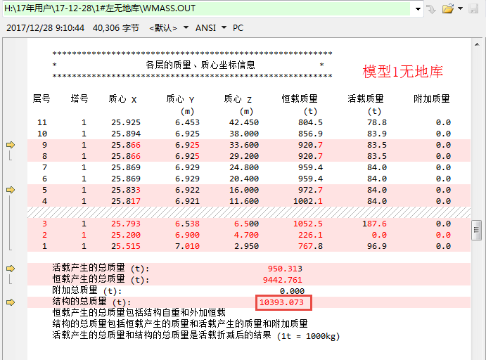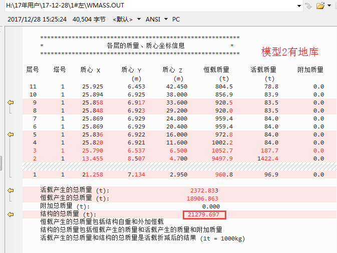 2)同时两个模型主要在于地震作用下的质量差异上,如下图:两个模型由于一个存在外扩的地下车库部分,其地下室部分的自重和荷载导致其质量Geq是另一个的2倍以上,同样地震作用经典的描述为Fek=AlphaGeq,这就直接导致其地震作用水平有了明显的上升,其侧向刚度增大的幅度并没有地震作用增大的多,所以侧向位移u呈增大的趋势。