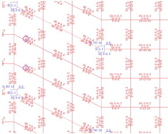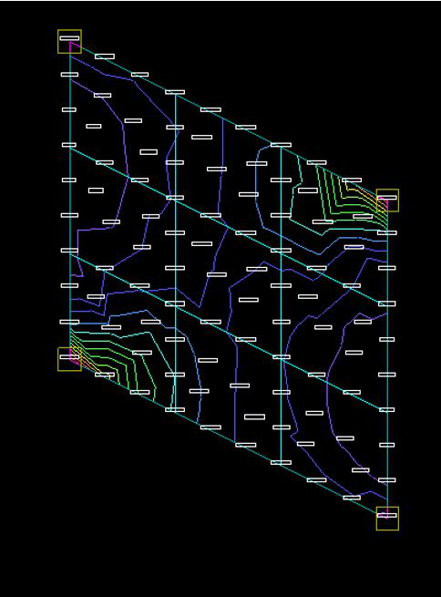 答:通过分析,发现每个独立的平行四边形房间都存在相同的问题,如附图所示。问题转变为该房间为什么会出现这样内力和配筋趋势。该房间的形状接近于菱形,其竖向荷载作用下的内力,由水平构件传递给竖向构件,在竖向构件刚度相差不大的情况下,本着传力路径越短,传递效率越高的原则,传力路径按照附图中所标示的方向传递,最终传递给1、2号柱及周围区域,内力在房间平面中最大,因此靠近1、2号柱的梁端内力就大,下图中楼板应力和弯矩的分布也证实了上述判断,所以紫色线圈出的这些位置对应的支座配筋比远离这两个位置就大得多。