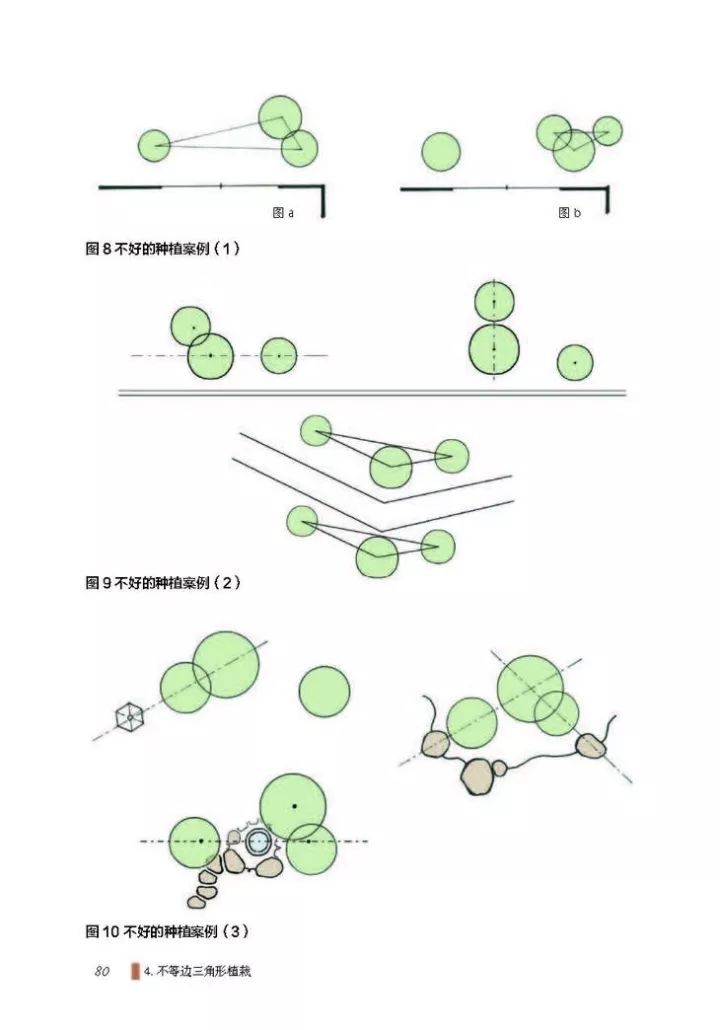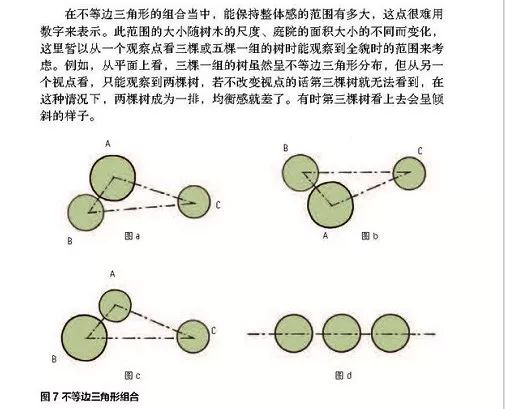 ⊙不等边三角形植栽:考虑种植计划时,可以有一颗独树的情况组团种植时,最小单位至少考虑三颗树,四棵树可以三棵树加一棵的形式来考虑。