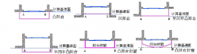 ②两侧或一侧有分户隔板的凸阳台,凹阳台以及半凹半凸阳台,以阳台栏杆面与外墙相交的墙洞口为计算基准面设计封窗的阳台,以封窗的阳台栏杆面为计算基准面。(如下图)