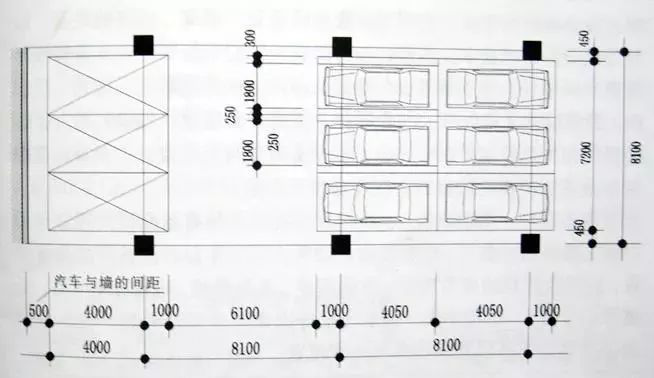 在相同的车库面积中柱越多,减少的停车位越多,若两柱间由停2辆车改为停3辆车时,由于柱距加大,柱子减少,可以多停约5%的车,即每停20辆车可增加1辆车的面积。故当车库规模较大时,应按每柱距间停放3辆车考虑。