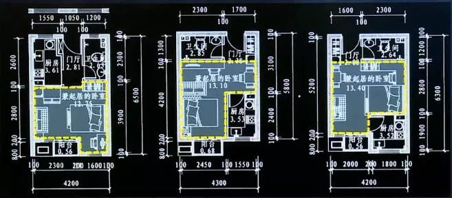 由兼起居的卧室、厨房和卫生间组成的在小套型,其使用面积不小于22㎡。