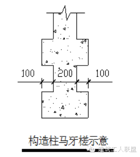 (1)构造柱构造:砌砖墙时,与构造柱连接处砌成马牙槎。每一个马牙槎沿高度方向的尺寸为20㎝(即一皮砌块高度),马牙槎应先退后进,进退尺寸为100mm,见下图。