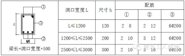 6、门窗过梁:门窗过梁可预制,可现浇。按设计图纸要求,砌体填充墙过梁可根据洞口宽度按下图施工,当洞口离柱或混凝土墙距离<250mm时,其过梁应现浇,可先由柱、混凝土墙留出过梁纵向钢筋,砌筑时现浇。